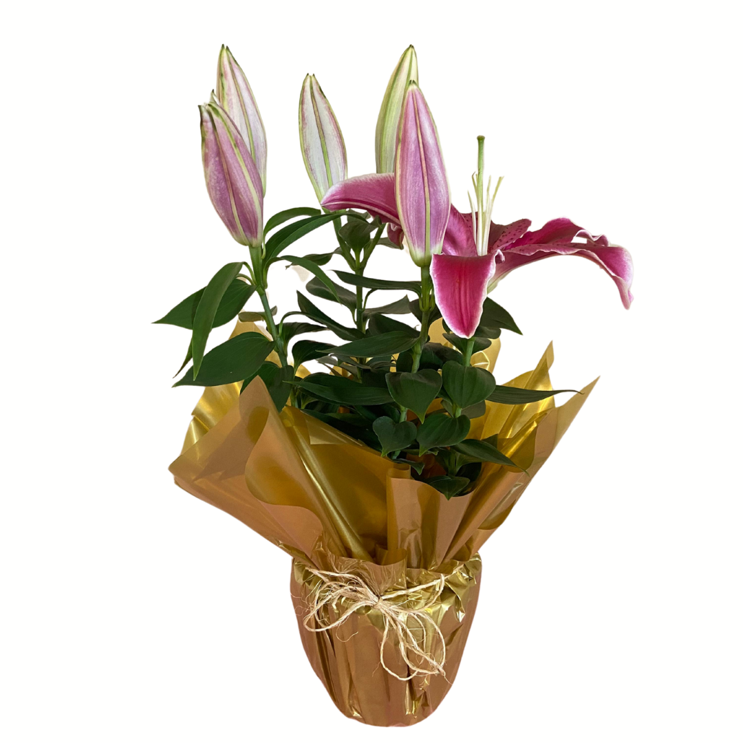 Essência Serena – Um vaso de lírios plantado que exala elegância e tranquilidade, perfeito para levar paz, beleza e um toque sofisticado à decoração de qualquer ambiente.