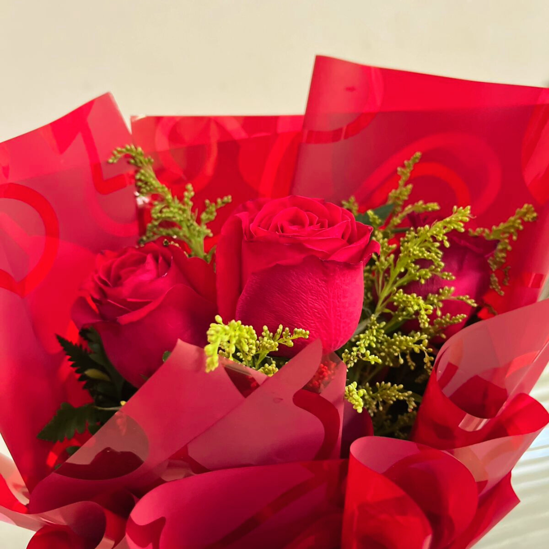 Mini buquê tradicional com 3 rosas vermelhas e folhagens. O pedido acompanha cartão de mensagem. Escreva ao finalizar a compra.